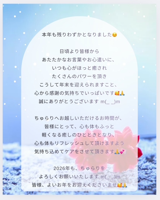 本年も誠にありがとうございました m(_ _)m 2025 12/28 伝えたい事 2025年12月28日 皆様こんにちは🥰本年も残り3日となりました✨️数日前から冷え込みがさらに厳しくなりましたが皆様、寒さに負けてないですか❓️😍感謝の気持ちをたくさん込めて🙏本年最後の配信をさせて頂きますm(_ _)m 伝えたい事 よかったらシェアしてね! URLをコピーしました! URLをコピーしました! 1月おすすめコース♪ この記事を書いた人 セラピストRieのハッピーブログ 関連記事 ♪ハッピーブログの第1歩♪ 2023年4月8日 好きな事を仕事にするまでの道のり♪ 2023年4月24日 ♡2023年6月ちゅらりだより♡ 2023年6月27日 ♪2023年7月のちゅらりだより♪ 2023年8月5日 ♪2023年8月8日(火)の記録♪ 2023年8月14日 ♪2023年8月10日(木)の記録♪ 2023年8月16日 ♪2023年8月11日(祝金)の記録♪ 2023年8月19日 ♪2023年8月12日(土)の記録♪ 2023年8月21日 コメント コメントする コメントをキャンセルコメント ※ 名前 ※ メール ※ サイト 次回のコメントで使用するためブラウザーに自分の名前、メールアドレス、サイトを保存する。 上に表示された文字を入力してください。