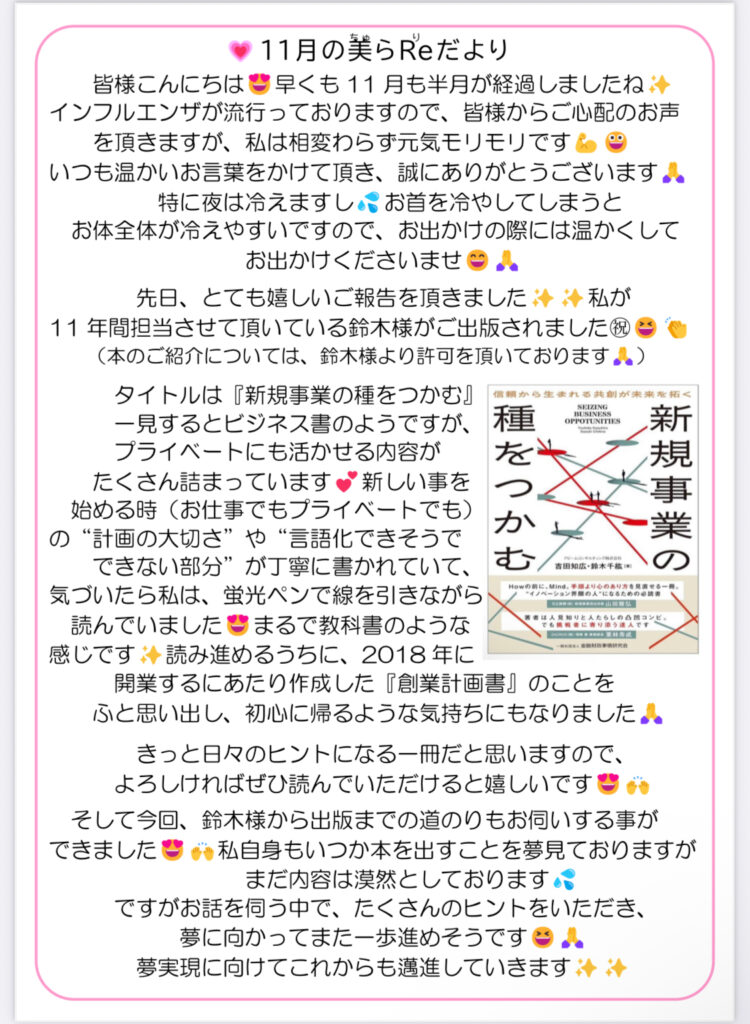 皆様こんにちは💕11月も中旬に入り、本日も秋晴れでとても気持ちいいですね👋😍今回は、今月のちゅらりだよりを配信させて頂きます✨️ぜひお時間がある時にお読み頂けますと幸いです🙏💕