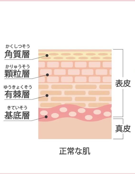 皮膚は表面から順に、角質層・顆粒層・有棘層・基底層の4層構造になっており、基底層で新しい細胞が作られ、徐々に押し上げられて角質層に達し、最終的にアカとなって剥がれ落ちます。